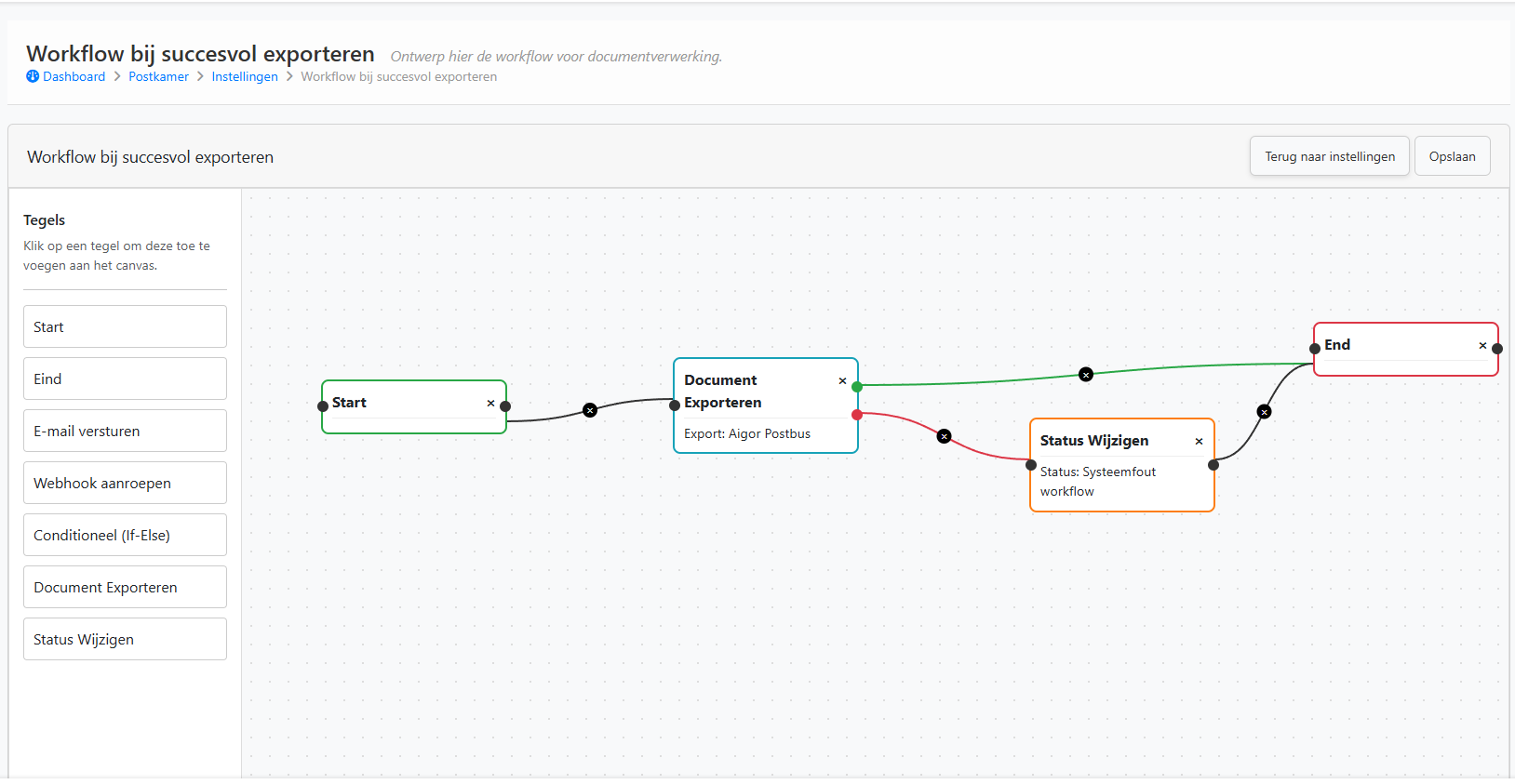 Met behulp van tegels stel je visueel een workflow samen. Zo kun je automatisch documenten exporteren, statussen aanpassen, e-mails versturen, webhooks aanroepen en conditionele logica toepassen. De workflow wordt uitgevoerd zodra een document succesvol is verwerkt door de AI Postkamer.
