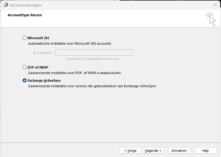 Selecteer "Exchange ActiveSync" als methodiek.
