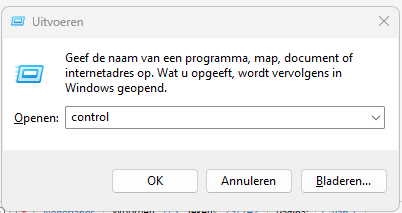 Druk op de Windows-toets + R om het dialoogvenster 'Uitvoeren' te openen. Typ het commando "control" in het lege vak.