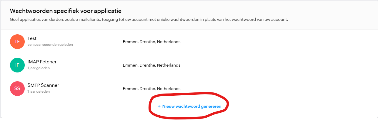 Klik nu in het venster op "+ Nieuw wachtwoord genereren".