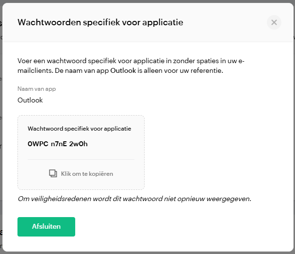 Je krijgt nu een app-wachtwoord. Bewaar deze goed aangezien deze alleen nu zichtbaar is. Ben je deze kwijt, dan kun je deze niet herstellen en moet je een nieuwe wachtwoord maken. Klik op afsluiten.