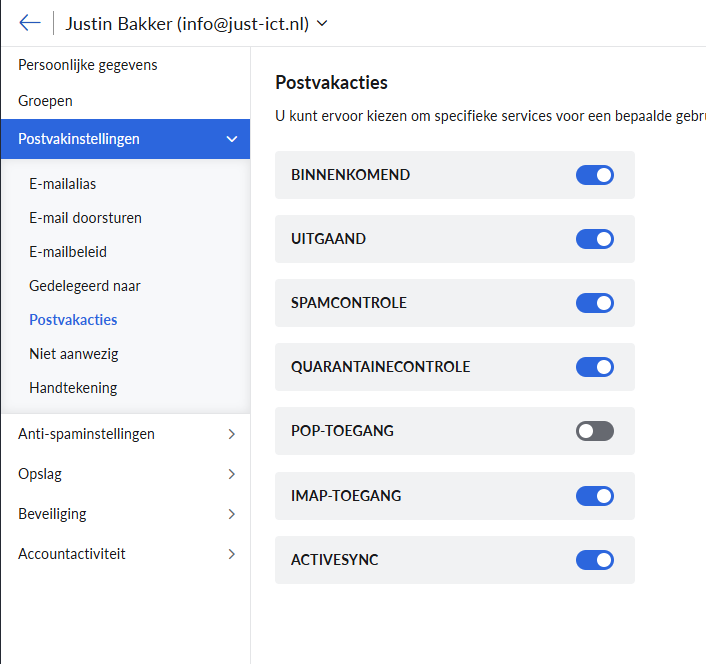 Er opent nu een overzicht. Vouw Postvakinstelingen uit > Klik op Postvakacties > En schakel ActiveSync in.