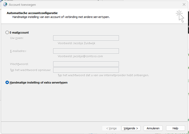 Er opent direct een venster "Account toevoegen", wijzig de instellingen naar Handmatige instellingen of extra servertypen.