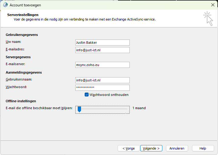 Vul het formulier in. Gebruik je eigen gegevens van het e-mailadres. Bij e-mailserver vul je msync.zoho.eu in.