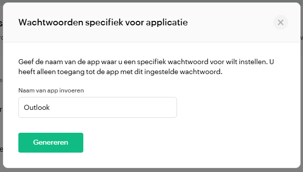 Wanneer de gebruiker twee-factor authenticatie aan heeft staan moet er een App-wachtwoord worden gemaakt. Dit wachtwoord gebruik je verderop om in te loggen bij outlook.