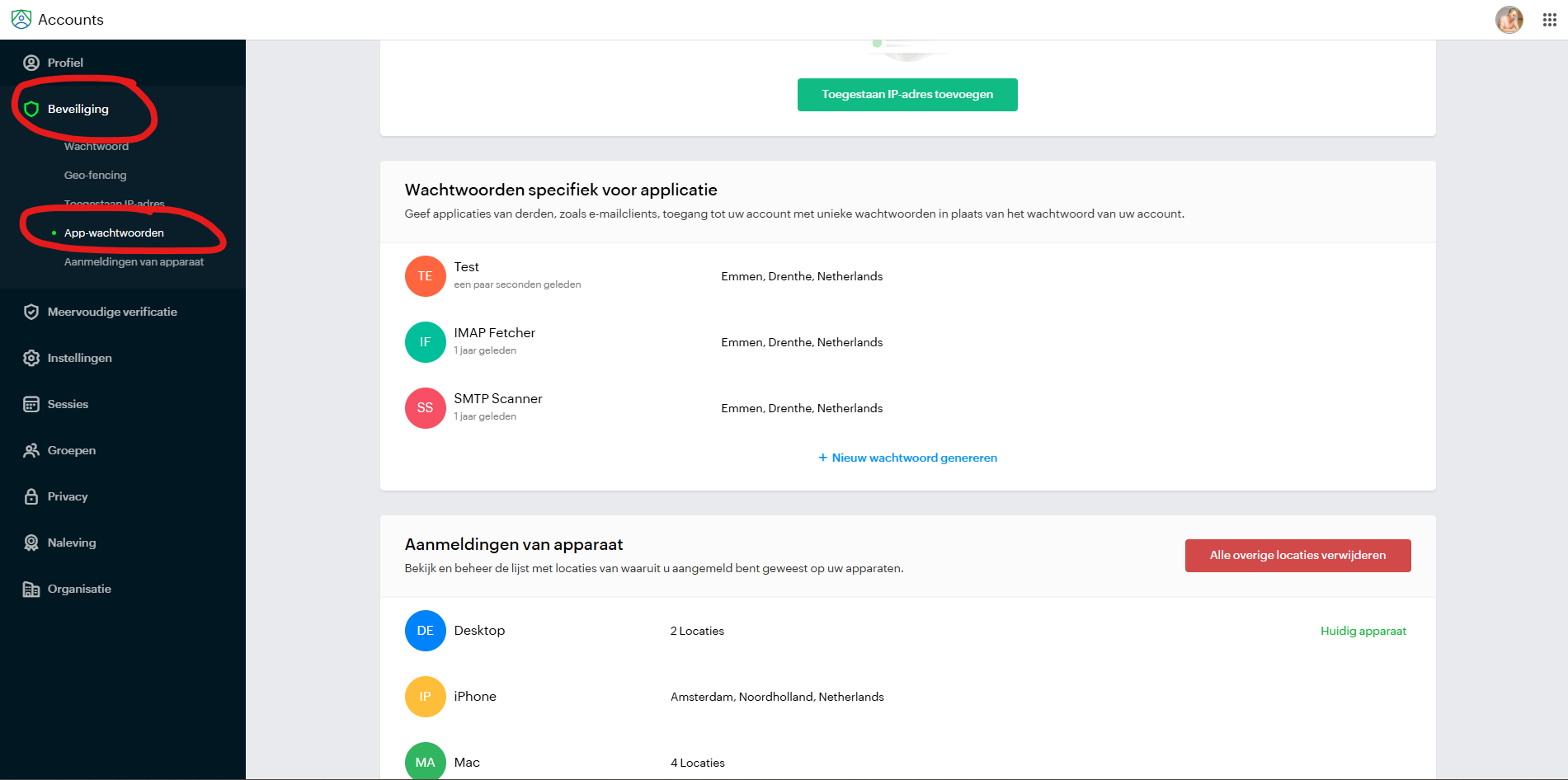 Klik op Beveiliging > App wachtwoorden.